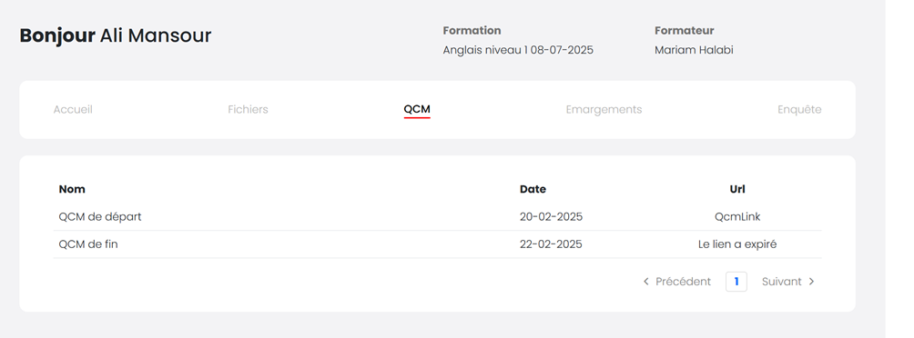 Cet onglet contient les liens vers tous les quiz associés à votre session.