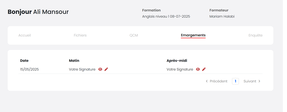 Dans cet onglet, vous pouvez signer votre présence le jour de la session.