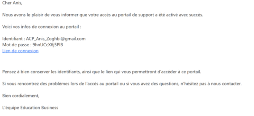 Le client reçoit selon le modèle de mail configuré (Le nom du modèle de mail doit être le même qui est indiqué dans le code du bouton) :