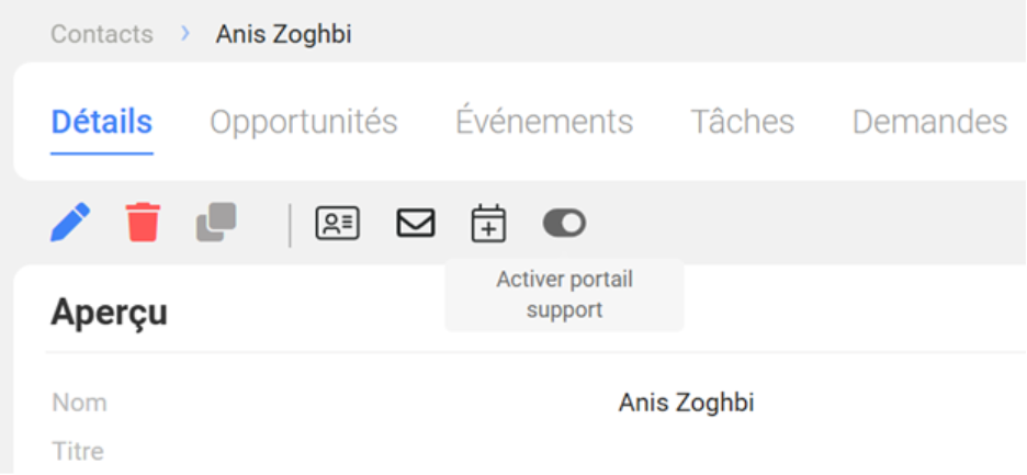 Sur la fiche Contact, cliquer sur Activer le portail client.